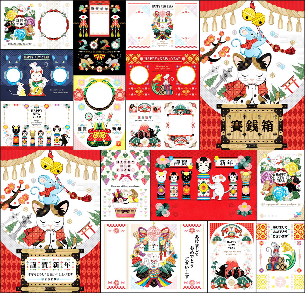 2020年 令和2年子年無料イラスト年賀状デザイン 鼠と猫とで初詣 謹賀新年 販売デザインサンプル むしとりねこ Awrd アワード